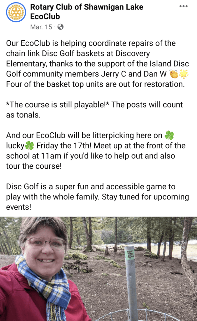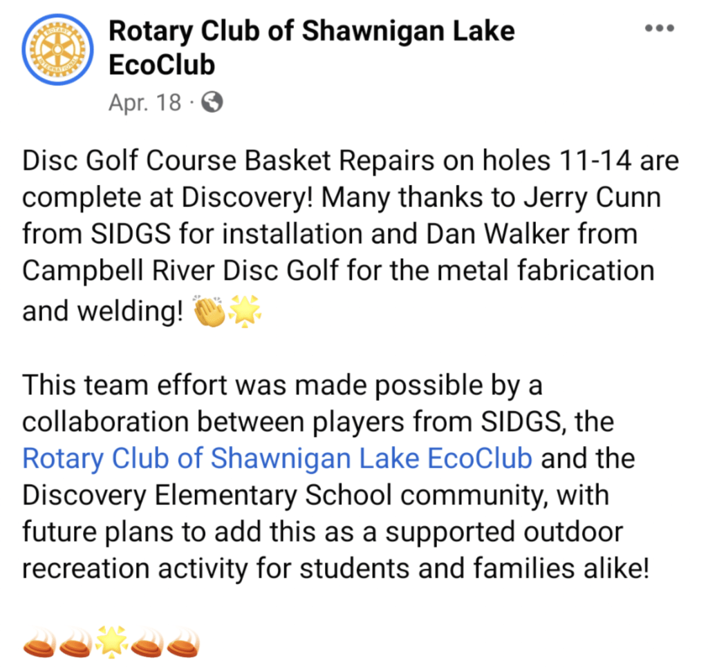 The course was repaired in April/May of 2023, with help from Dan Walker of Campbell River Disc Golf, and Jerry Cunn of South Island Disc Golf Society (SIDGS), and made possible with funding by the Discovery PAC – many thanks!