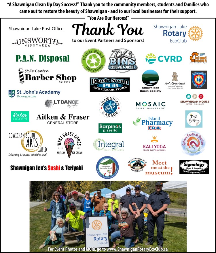 Thank you to all of our participants, industry partners, schools and community groups! Special thanks for the support of our Event Sponsors – Fisher Rd Recycling / DL’s Bins, the CVRD and our Area B Director, Emcon Services Ltd., Unsworth Vineyards, Mason’s Store, and Island Return-It (South Cowichan). Special thanks also to Signology Signs & Graphics, Relax Collective, and London Drugs PhotoLab for being our sources of wayfinding, branding and printed materials!