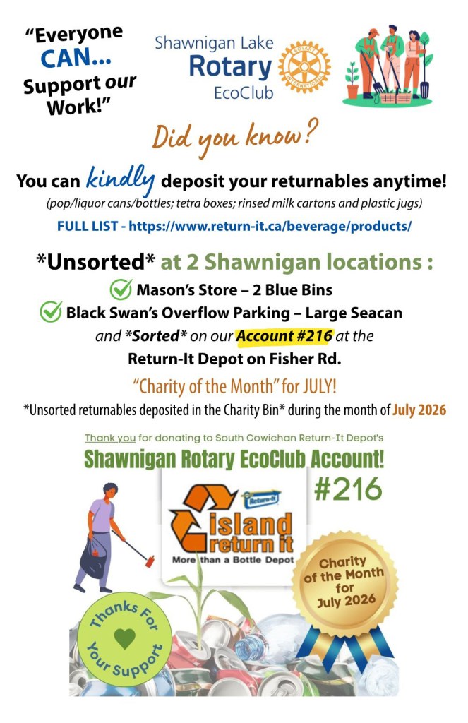 Saturday morning July 31st is our FKSS Garden weeding+pizza blitz from 9am-12noon. Please email us at ShawniganRotaryEcoClub@gmail.com by Friday if you’ll be there so we can plan for the 11:30am veggie pizza delivery! Any time you can spare for this service project is much appreciated and will make a positive difference! Plus be messy fun!! Update: SUCCESS! THANK YOU TO OUR WONDERFUL PARTICIPANTS AND PANAGO PIZZA!